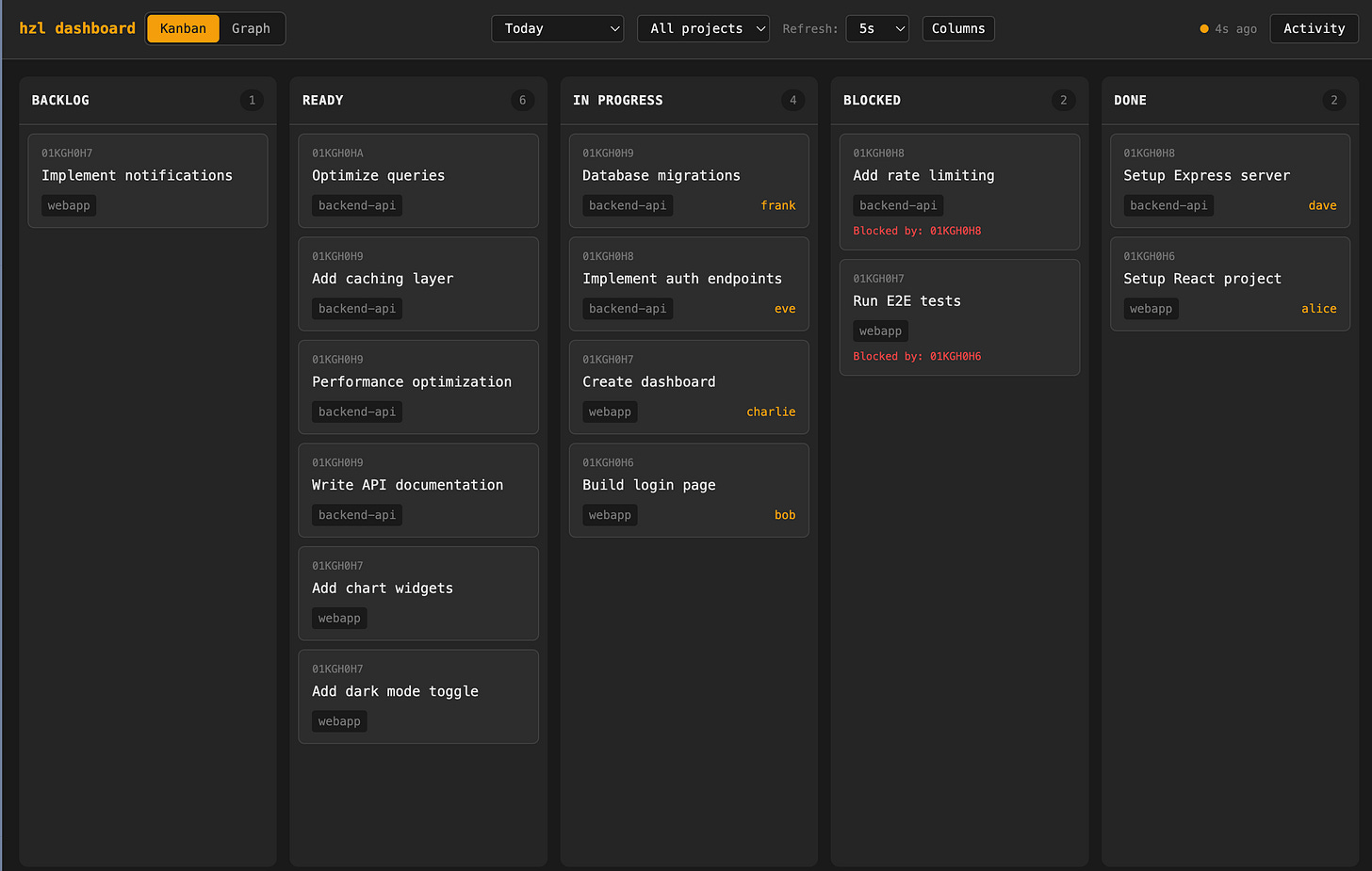 One design choice worth noting: HZL assumes a single ledger for all your projects. We’re not doing per-folder tracking with isolated ledgers in different directories. Instead, a single HZL instance supports multiple projects through project IDs within the same ledger, which keeps things simple and queryable across everything you’re working on.